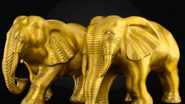 《金象赐福》取材于祥瑞之象,通体鎏金光泽耀眼,造型厚重端庄,象身细节雕刻精致。大象自古寓意“太平有象”,与“祥”谐音,象征吉祥、安泰与富贵。这对金象组合,既有守护寓意,又具旺财功效,是家居装饰、企业陈设与馈赠礼品的上佳之选。